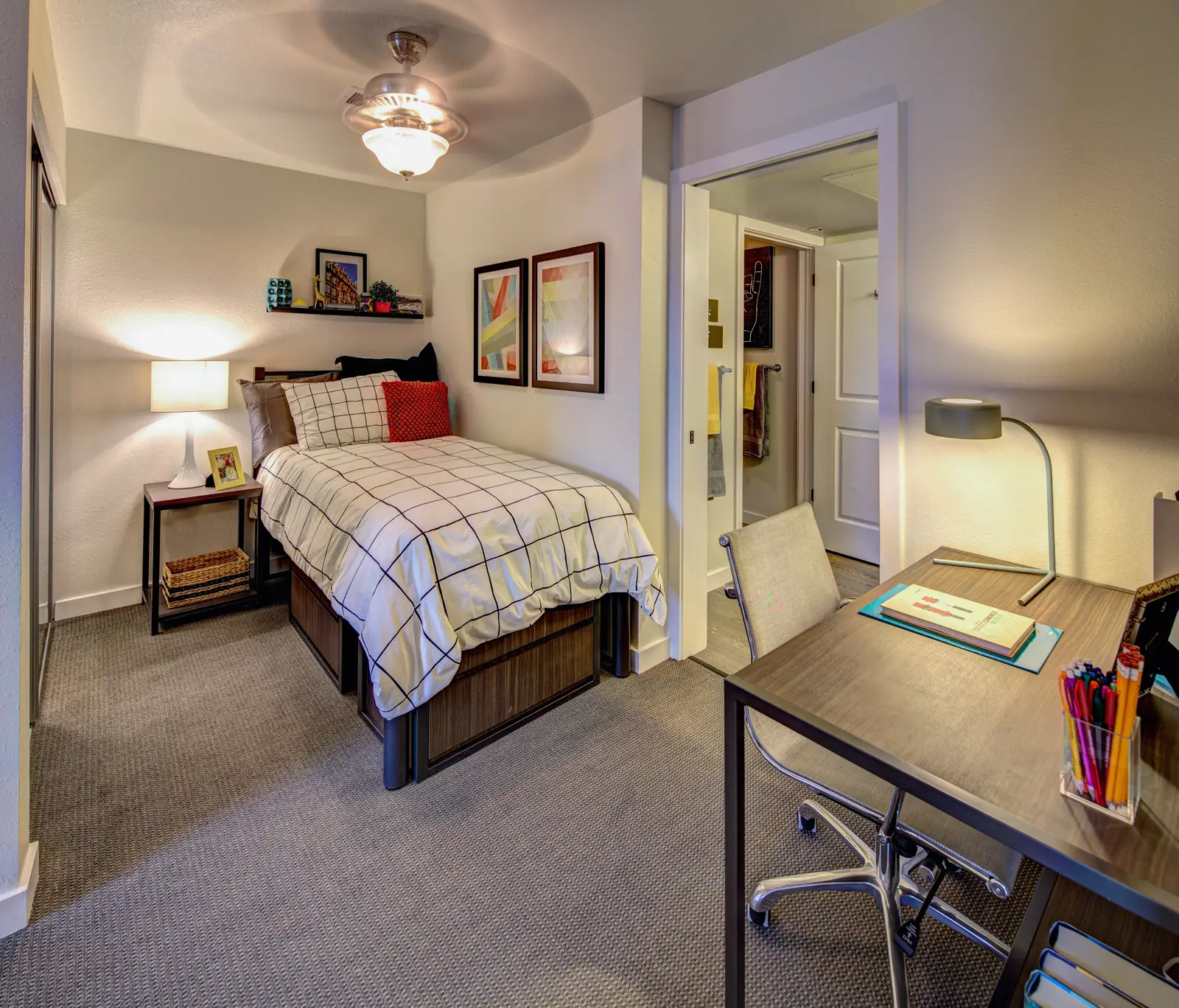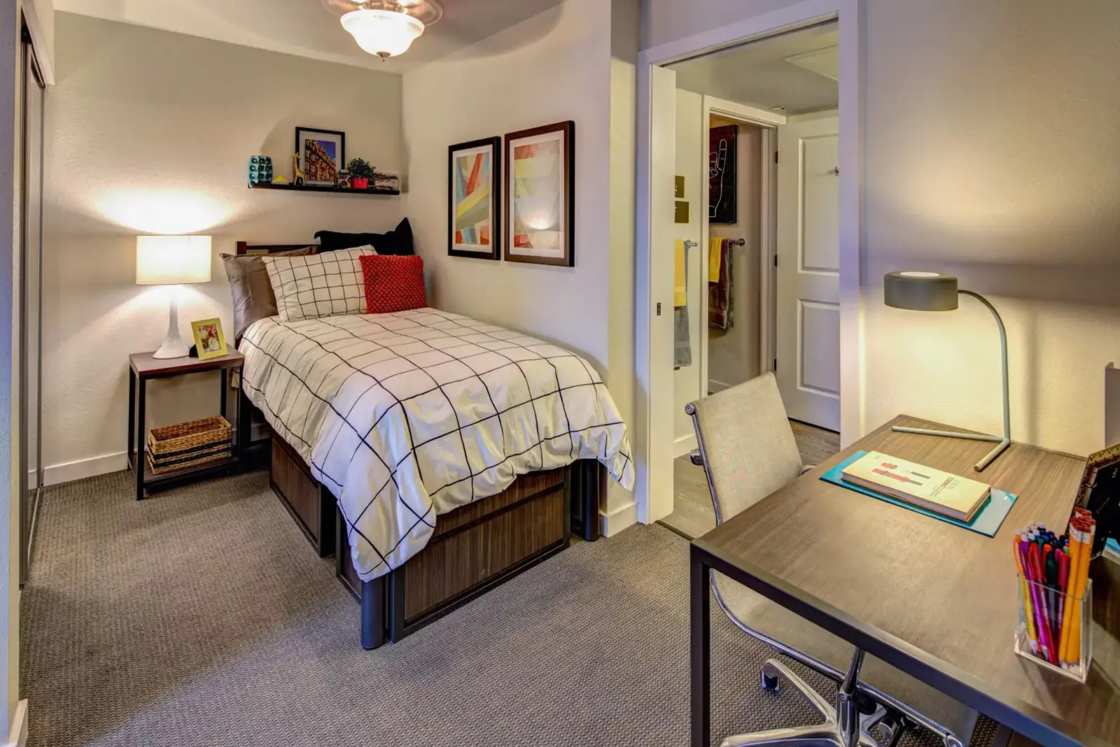 The View is made up of 2, and 4 bedroom suites. The units include stainless steel appliances, granite countertops, and wood plank flooring. The property offers various amenities including a pool, fitness center, study lounge, community kitchen, BBQ grills, ping pong tables, and more.
